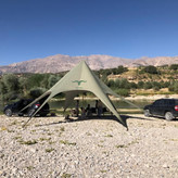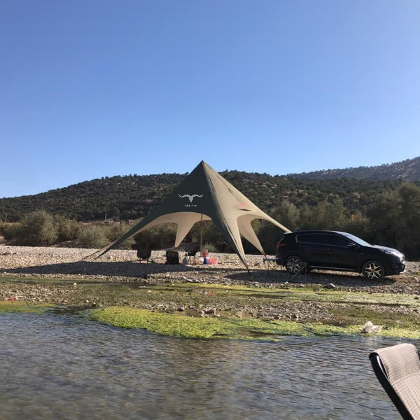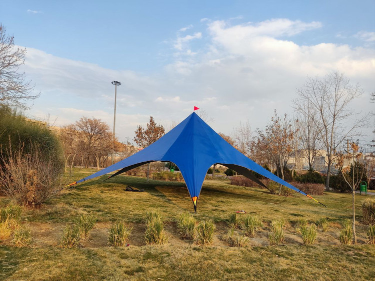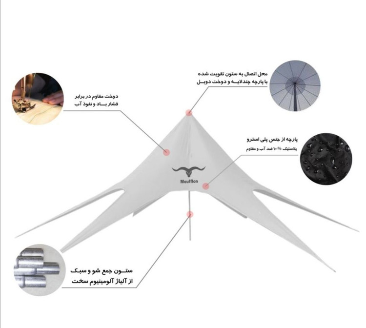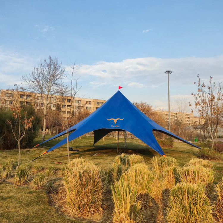 سایبان ستاره ای موفلان مدل استار تنت سایبانی بسیار جذاب و زیبا برای کمپها دورهمی ها، گروه های ورزشی همچنین همایش و مراسمات و جشن های شما میباشد که علاوه بر طراحی زیبا و چشمگیر از رنگهای بسیار جذابی برخوردار است.. اغلب در سفرها، اطراف سواحل و کویرها با مشکل نبود سایه مواجه هستیم حتی شاید ساعتها دنبال جای مناسب دارای سایه بگردیم یا مجبور به ترک کردن محل کمپمون بشیم بخاطر بارش ناگهانی باران.. سایبان ستاره ای رو میتونید کمتر از ده دقیقه بنا کرده از سایه ان لذت برده و از طراحی جذاب ان متعجب شوید و در کنار عزیزانتان بهترین لحظات را ثبت نمایید.. جنس پارچه از پلی استر سه لایه بسیار مقاوم است همچنین دوخت ان در مقابل کشش های ناشی از جریان باد و بارش باران مقاومت بالایی دارد. طراحی این سایبان به نحوی بوده تا بتواند بیشترین مساحت سایه را ایجاد کند، همچنین ارتفاع قسمتهای هلالی ان بلند درنظر گرفته شده تا علاوه بر گردش ازاد هوا، رفت و امد افراد زیر ان به راحتی میسر باشد، همچنین بتوان زیر ان چندین میز و صندلی برای حتی گروه های پر جمعیت قرار داد.یا چندین چادر در زیر ان بنا کرد همچنین قابلیت ورود خودرو به زیر سایبان هم وجود دارد، تا در مقابل بارشهای ناگهانی و تابش مستقیم نور آفتاب در امان باشید.. در طراحی این محصول قسمتهایی بصورت جیب برای نگه داری از لوازم کوچک مانند گوشی موباید یا پاور بانک در نظر گرفته شده، ودر قسمت هلالی تسمه هایی برای نصب ریسه دوخته شده که میتوان با نصب لامپ ریسه ای محیطی رویایی را در تاریکی شب ایجاد کرد. ضمنا این محصول دارای کیت حرفه ای برای نصب میباشد که شامل: 6عدد میخ ساده ابکاری شده(مخصوص زمینهای سخت و جنگلی) میباشد 6عدد میخ نبشی ابکاری شده (مخصوص زمینهای نرم و شنی) میباشد دستکش،جهت کار با قسمتهای فلزی میباشد چکش مخصوص میباشد دفترچه راهنمای نصب میباشد.