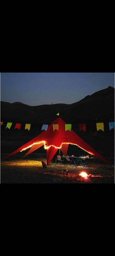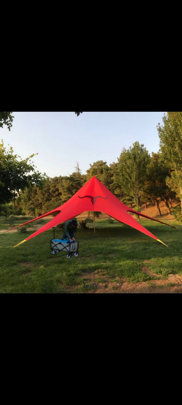 سایبان ستاره ای موفلان مدل استار تنت سایبانی بسیار جذاب و زیبا برای کمپها دورهمی ها، گروه های ورزشی همچنین همایش و مراسمات و جشن های شما میباشد که علاوه بر طراحی زیبا و چشمگیر از رنگهای بسیار جذابی برخوردار است.. اغلب در سفرها، اطراف سواحل و کویرها با مشکل نبود سایه مواجه هستیم حتی شاید ساعتها دنبال جای مناسب دارای سایه بگردیم یا مجبور به ترک کردن محل کمپمون بشیم بخاطر بارش ناگهانی باران.. سایبان ستاره ای رو میتونید کمتر از ده دقیقه بنا کرده از سایه ان لذت برده و از طراحی جذاب ان متعجب شوید و در کنار عزیزانتان بهترین لحظات را ثبت نمایید.. جنس پارچه از پلی استر سه لایه بسیار مقاوم است همچنین دوخت ان در مقابل کشش های ناشی از جریان باد و بارش باران مقاومت بالایی دارد. طراحی این سایبان به نحوی بوده تا بتواند بیشترین مساحت سایه را ایجاد کند، همچنین ارتفاع قسمتهای هلالی ان بلند درنظر گرفته شده تا علاوه بر گردش ازاد هوا، رفت و امد افراد زیر ان به راحتی میسر باشد، همچنین بتوان زیر ان چندین میز و صندلی برای حتی گروه های پر جمعیت قرار داد.یا چندین چادر در زیر ان بنا کرد همچنین قابلیت ورود خودرو به زیر سایبان هم وجود دارد، تا در مقابل بارشهای ناگهانی و تابش مستقیم نور آفتاب در امان باشید.. در طراحی این محصول قسمتهایی بصورت جیب برای نگه داری از لوازم کوچک مانند گوشی موباید یا پاور بانک در نظر گرفته شده، ودر قسمت هلالی تسمه هایی برای نصب ریسه دوخته شده که میتوان با نصب لامپ ریسه ای محیطی رویایی را در تاریکی شب ایجاد کرد. ضمنا این محصول دارای کیت حرفه ای برای نصب میباشد که شامل: 6عدد میخ ساده ابکاری شده(مخصوص زمینهای سخت و جنگلی) میباشد 6عدد میخ نبشی ابکاری شده (مخصوص زمینهای نرم و شنی) میباشد دستکش،جهت کار با قسمتهای فلزی میباشد چکش مخصوص میباشد دفترچه راهنمای نصب میباشد.